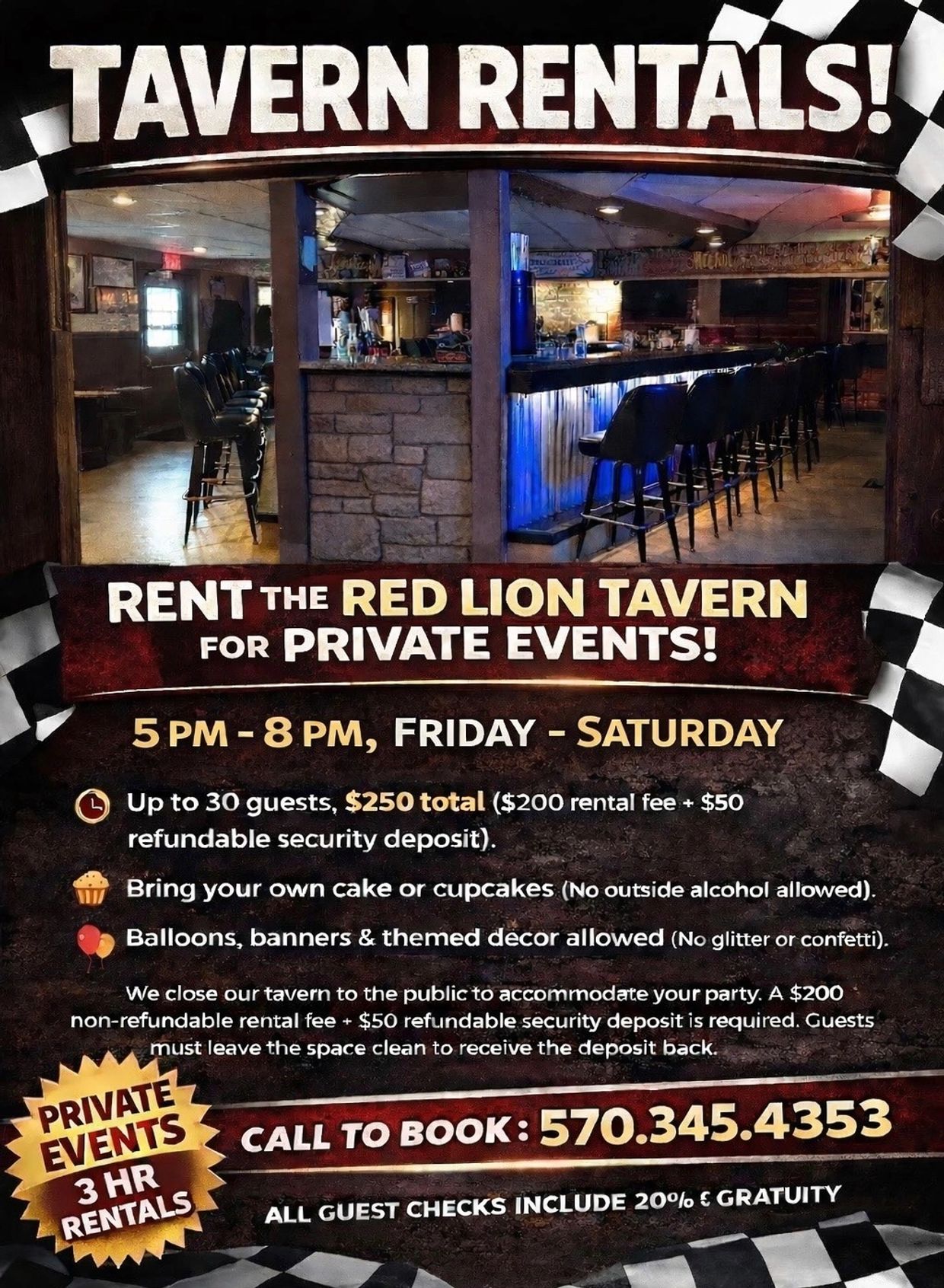 Rent the Red Lion Tavern for a 3-hour private party! Whether it’s a birthday, celebration, fantasy draft or special gathering, we’ve got you covered.